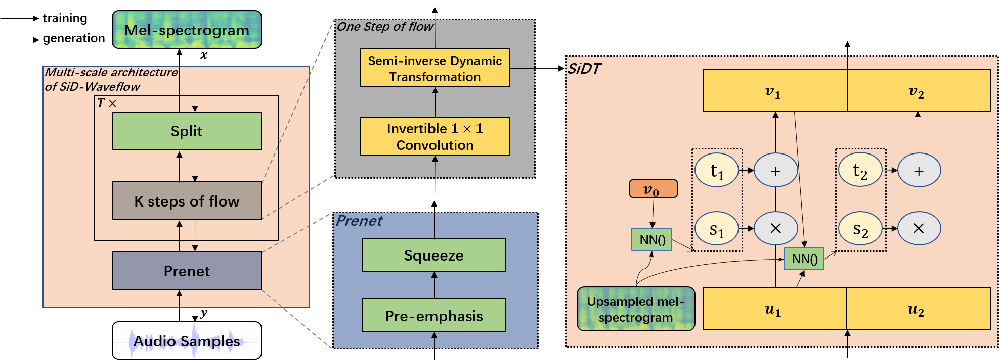 Abstract: Modern speech synthesis systems usually consist of an acoustic model and a vocoder. The acoustic models generate audio features which are then transformed into audio by the vocoders. The state-of-the-art vocoders require extensive training data. In this paper, we propose a novel vocoder, namely Semi-inverse Dynamic Waveflow (SiD-Waveflow) to avoid collecting large amounts of training data. SiD-Waveflow consists of a Prenet module, an invertible 1x1 convolution layer, and a Semi-inverse Dynamic Transformation (SiDT) module. The Prenet module is designed to improve the quality of the synthesized audio. The invertible 1x1 convolution can reorganize the order of the channels, which helps to improve the performance of SiD-Waveflow. The SiDT module is used as an invertible transformation in SiD-Waveflow, which can accelerate convergence speeds without pre-training. To our best knowledge, SiD-Waveflow is the first low-resource vocoder based on the flow architecture. Experimental results have demonstrated that SiD-Waveflow can generate audio with better quality than typical flow-based methods. Besides, SiD-Waveflow is more lightweight and requires lower computational resources.
